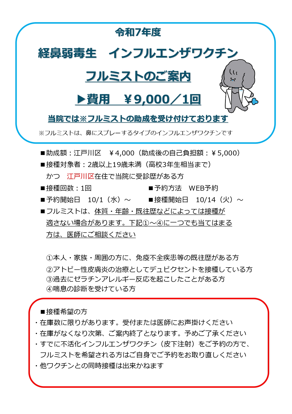 また、当院では「経鼻生ワクチン:フルミスト」もご案内開始することになりました。